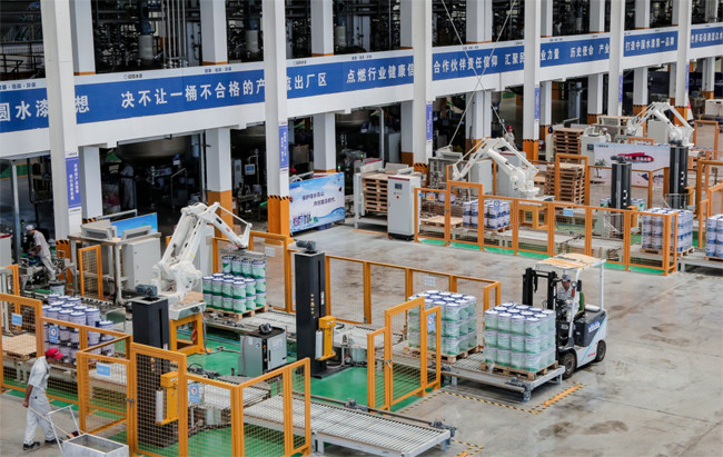 走在偌大的車間里,目光所及,見不到幾個工人,生產(chǎn)線上開足馬力的履帶和機械臂才是主角。董立志介紹說,在生產(chǎn)自動化、智能化方面,晨陽水漆一直走在前列,從生產(chǎn)到成品出庫自動化率達95%。