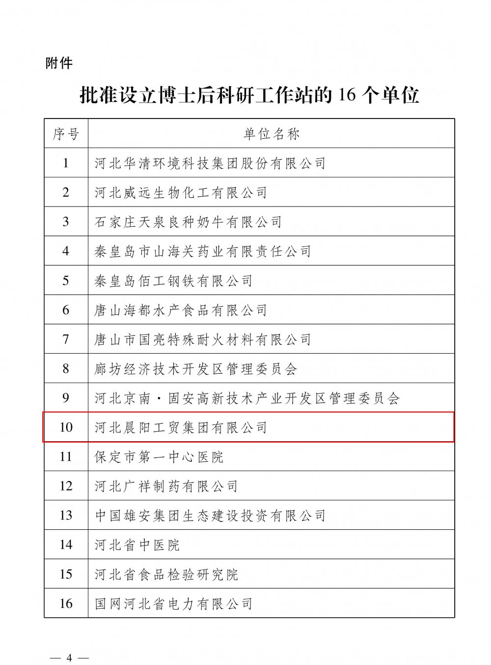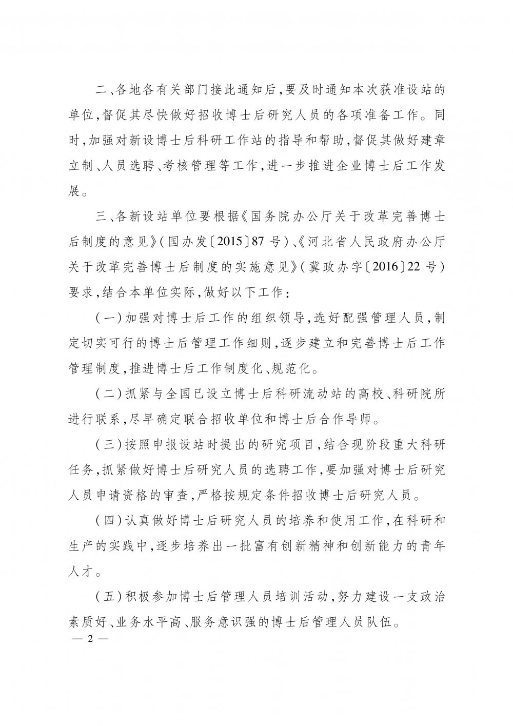 此次河北省被批準(zhǔn)設(shè)立博士后科研工作站的16個(gè)單位分別為河北華清環(huán)境科技集團(tuán)股份有限公司、河北威遠(yuǎn)生物化工有限公司、石家莊天泉良種奶牛有限公司、秦皇島市山海關(guān)藥業(yè)有限責(zé)任公司、秦皇島佰工鋼鐵有限公司、唐山海都水產(chǎn)食品有限公司、唐山市國(guó)亮特殊耐火材料有限公司、廊坊經(jīng)濟(jì)技術(shù)開(kāi)發(fā)區(qū)管理委員會(huì)、河北京南·固安高新技術(shù)產(chǎn)業(yè)開(kāi)發(fā)區(qū)管理委員會(huì)、河北晨陽(yáng)工貿(mào)集團(tuán)有限公司、保定市第一中心醫(yī)院、河北廣祥制藥有限公司、中國(guó)雄安集團(tuán)生態(tài)建設(shè)投資有限公司、河北省中醫(yī)院、河北省食品檢驗(yàn)研究院、國(guó)網(wǎng)河北省電力有限公司。